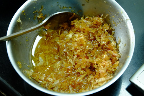 6. ใส่กระเทียมเจียวกับกากหมูลงไปแล้ว คลุกให้เข้ากัน ใส่ไว้ในตะกร้าให้สะเด็ดน้ำออกมาอีก สักครึ่งชั่วโมงก็เพียงพอ