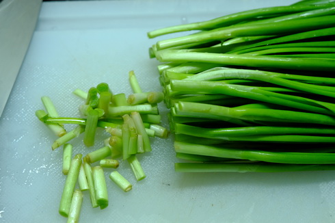3. หั่นตรงโคนออกนิดหน่อย แล้วหั่นกว้างสักประมาณ 10 มม. ไม่จำเป้นต้องตัดปลายออกเหมือนต้นหอมนะครับ ใช้ได้หมดเลย