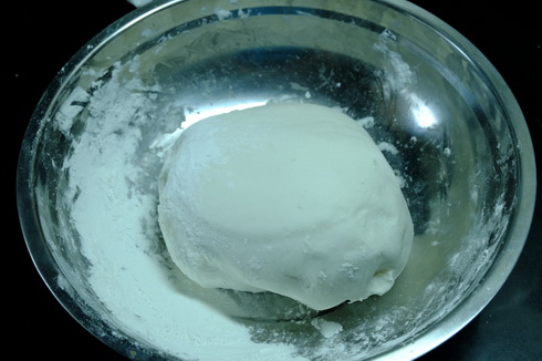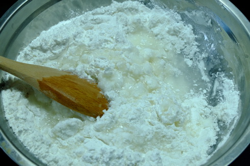 อัตราส่วน 2:1 แป้งข้าวเจ้ามากกว่า ต้มน้ำเดือดเลย แล้วค่อยๆ ผสมลงไปแล้วนวดๆ ใช้พายกวนให้เข้ากัน ใส่น้ำมันลงไปเล็กน้อย