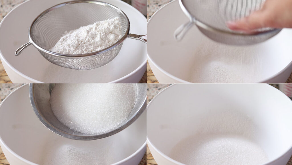 1.ร่อนแป้ง จากนั้นใส่น้ำตาลทรายลงไป คนให้เข้ากัน