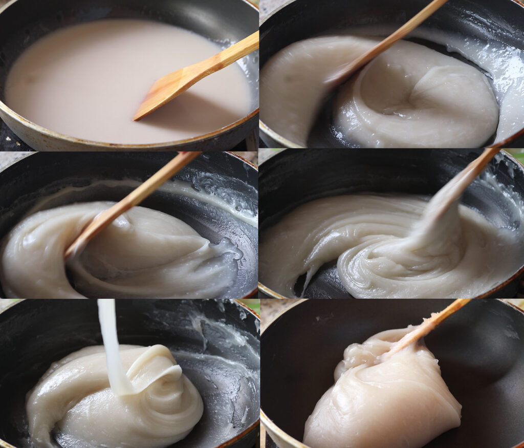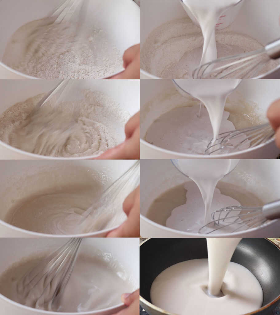 2.ค่อยๆใส่กะทิลงไป สามารถเพิ่มกลิ่นได้ค่ะ พอเข้ากันแล้ว เทส่วนผสมลงไปในกระทะ
