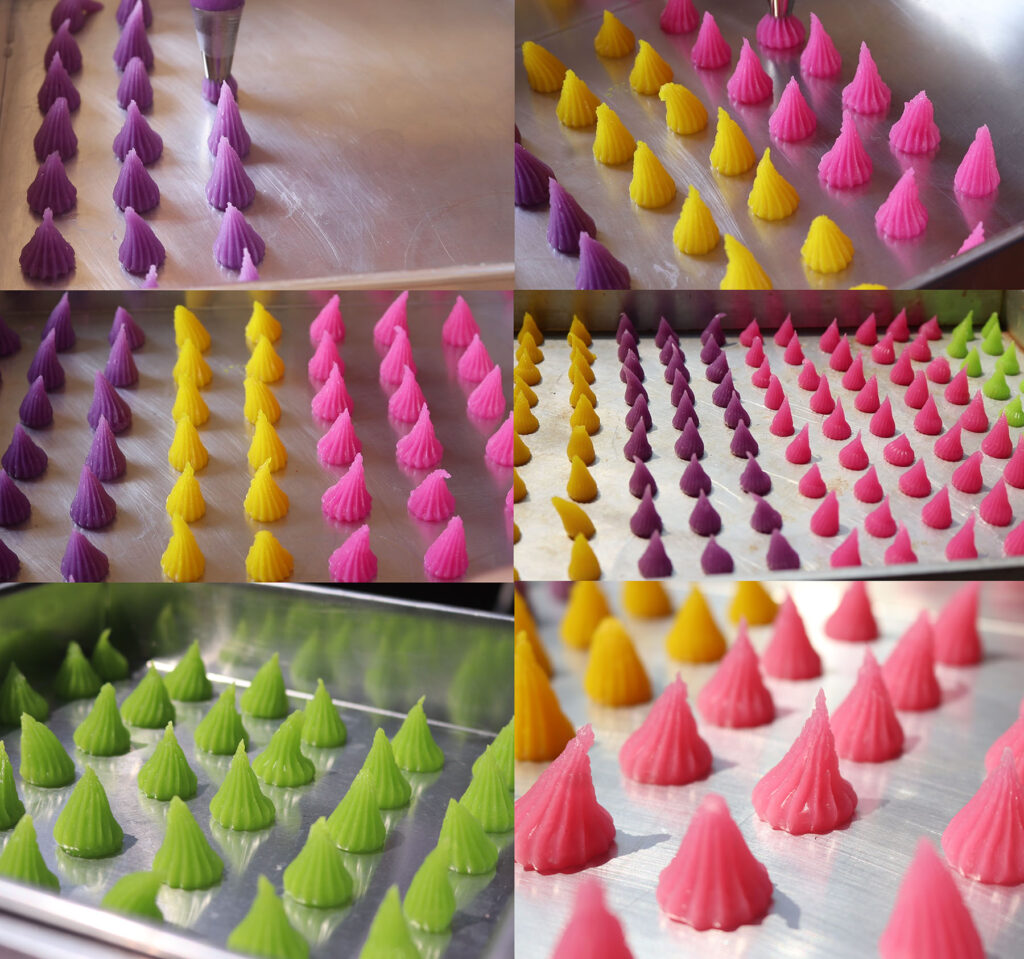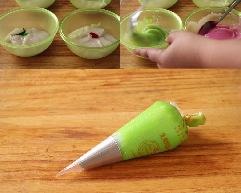 4.แบ่งใสาชาม ผสมสีตามชอบ คนให้คลายร้อนลงบ้าง จากนั้นเอาใส่ถุงบีบ