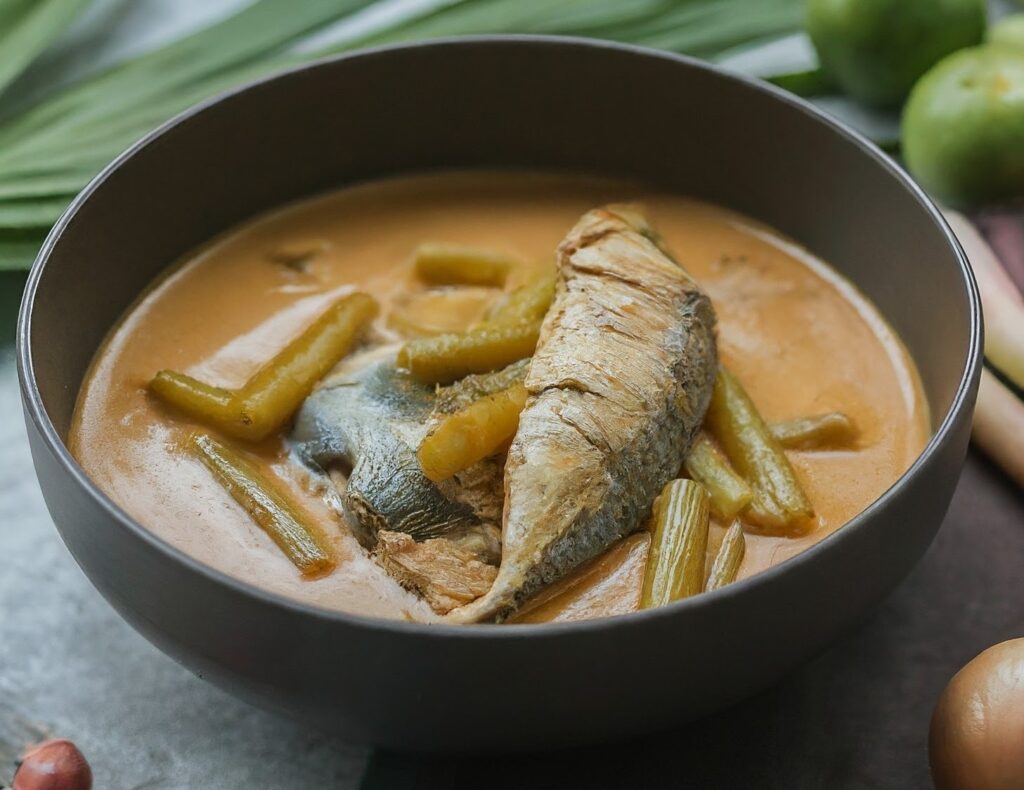 5.ใส่ปลาทูที่เตรียมไว้ลงไปในหม้อ ต้มจนปลาทูสุก (ประมาณ 5-7 นาที) จากนั้นใส่สายบัวและใบมะกรูดฉีกลงไป